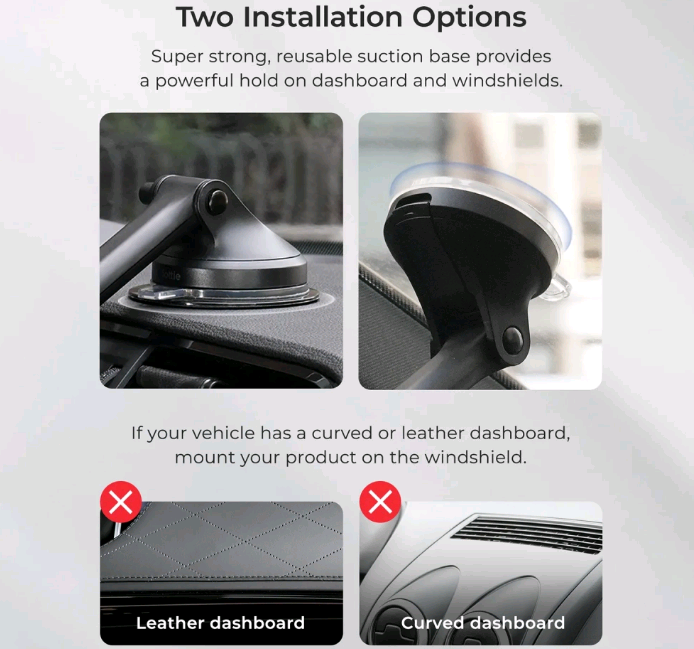 Μπορείτε να τοποθετείτε την συσκευή σας οριζόντια ή κάθετα, ώστε να έχετε την ιδανική γωνία θέασης. Η βάση διαθέτει ισχυρή βεντούζα με κολλώδες gel, επιτρέποντας τη σταθερή τοποθέτηση στο ταμπλό ή το παρμπρίζ σας, ενώ παράλληλα είναι επαναχρησιμοποιήσιμη και εύκολη στην αφαίρεση χωρίς να αφήνει υπολείμματα.
