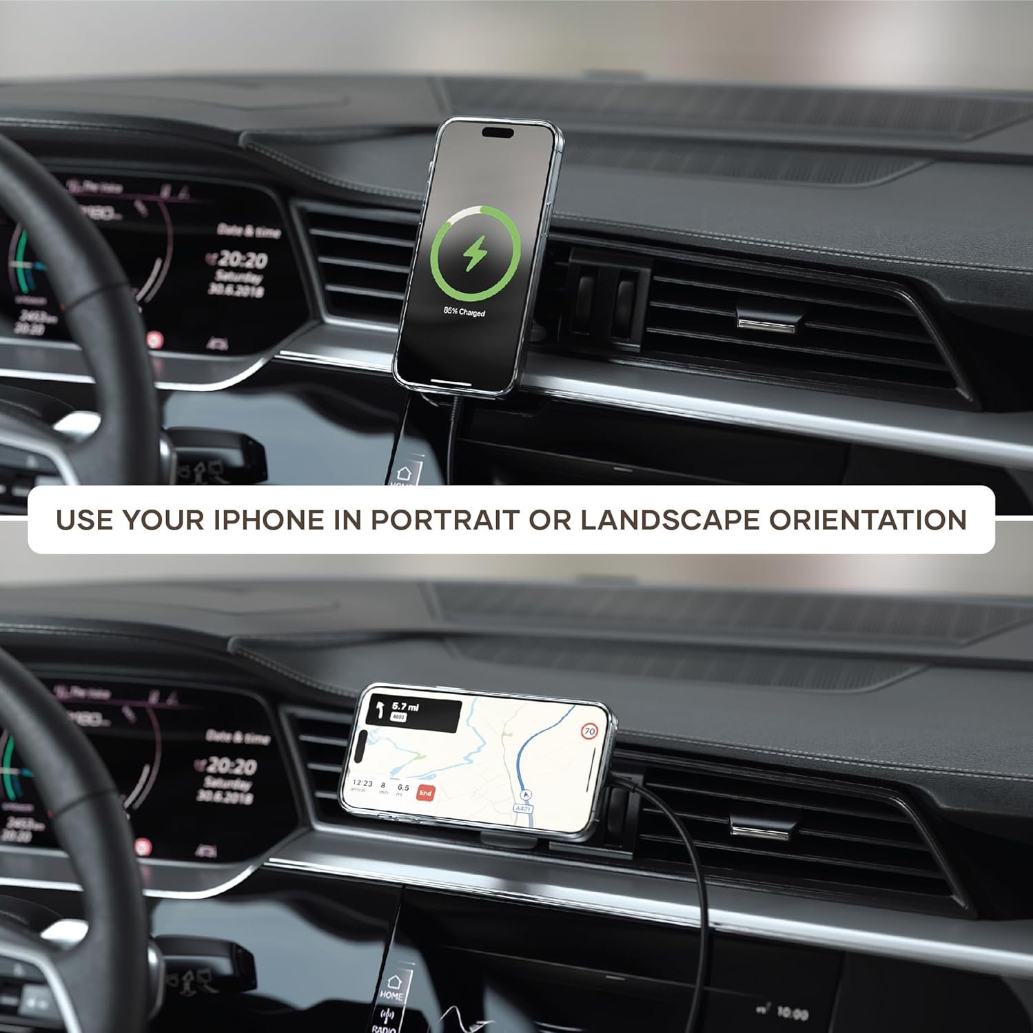 Η συμβατότητα με MagSafe επιτρέπει την ασφαλή μαγνητική σύνδεση της συσκευής σας, εξασφαλίζοντας σταθερότητα ακόμα και στις πιο απαιτητικές διαδρομές, ενώ ο υψηλής ποιότητας σφιγκτήρας του αεραγωγού κρατά τη βάση σταθερή.