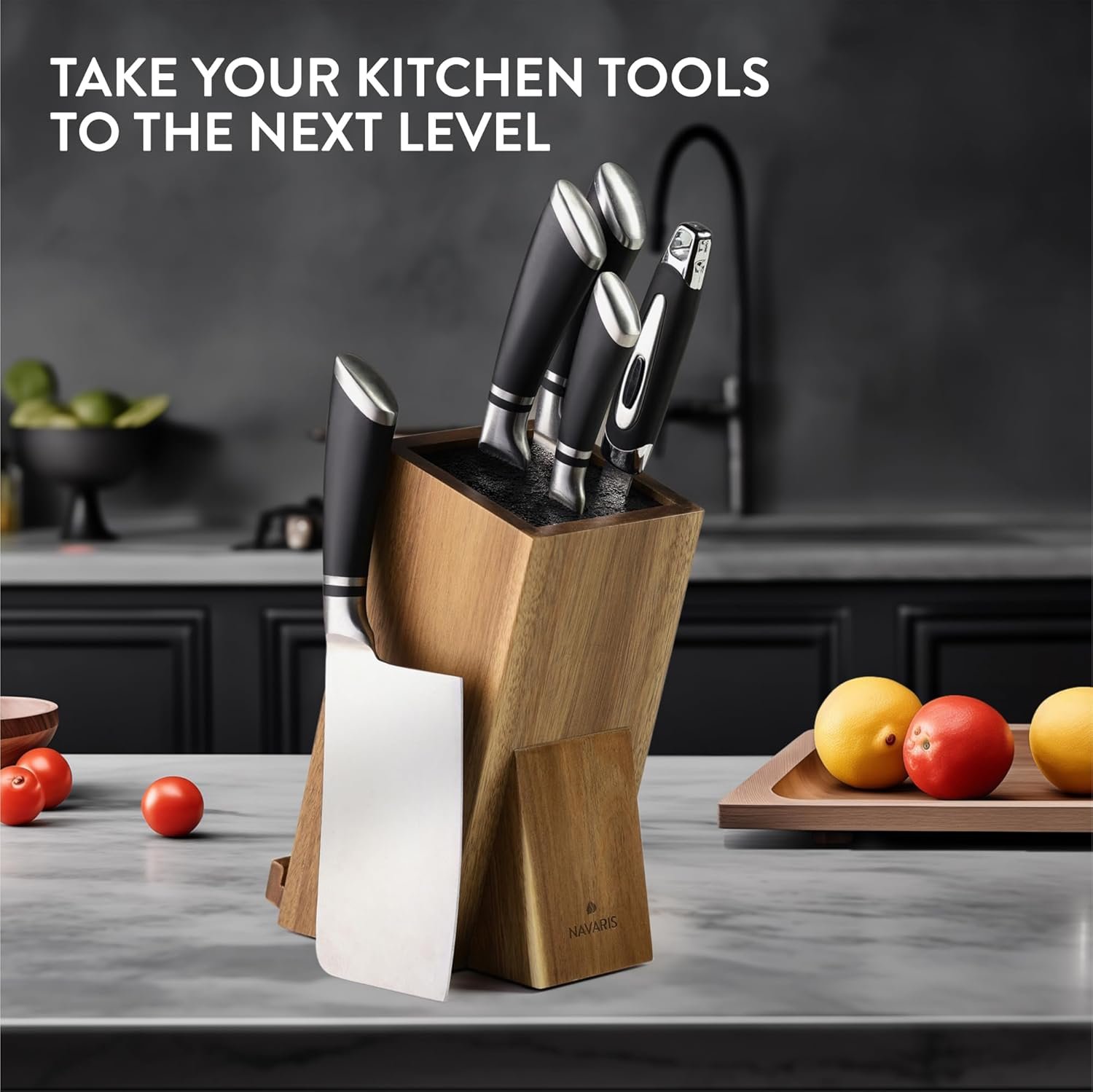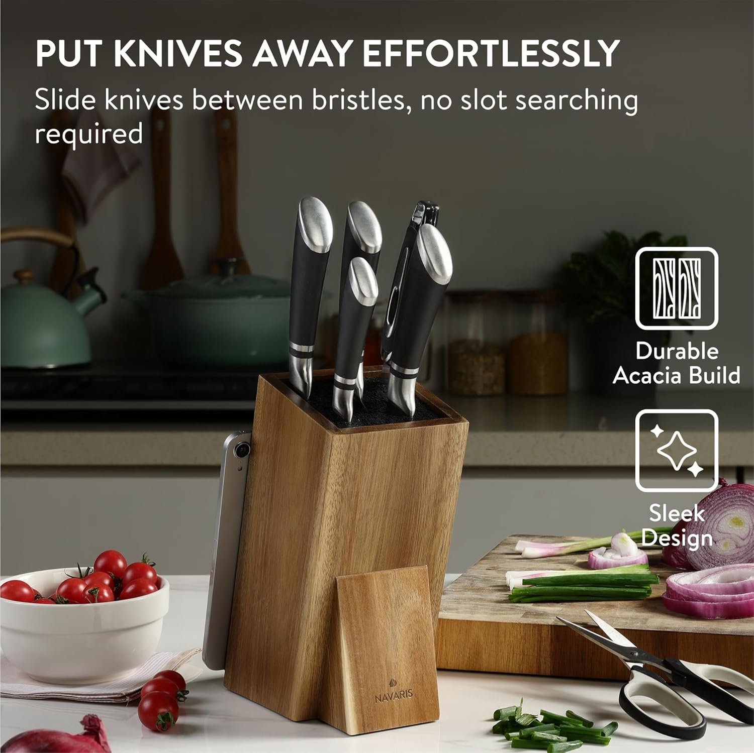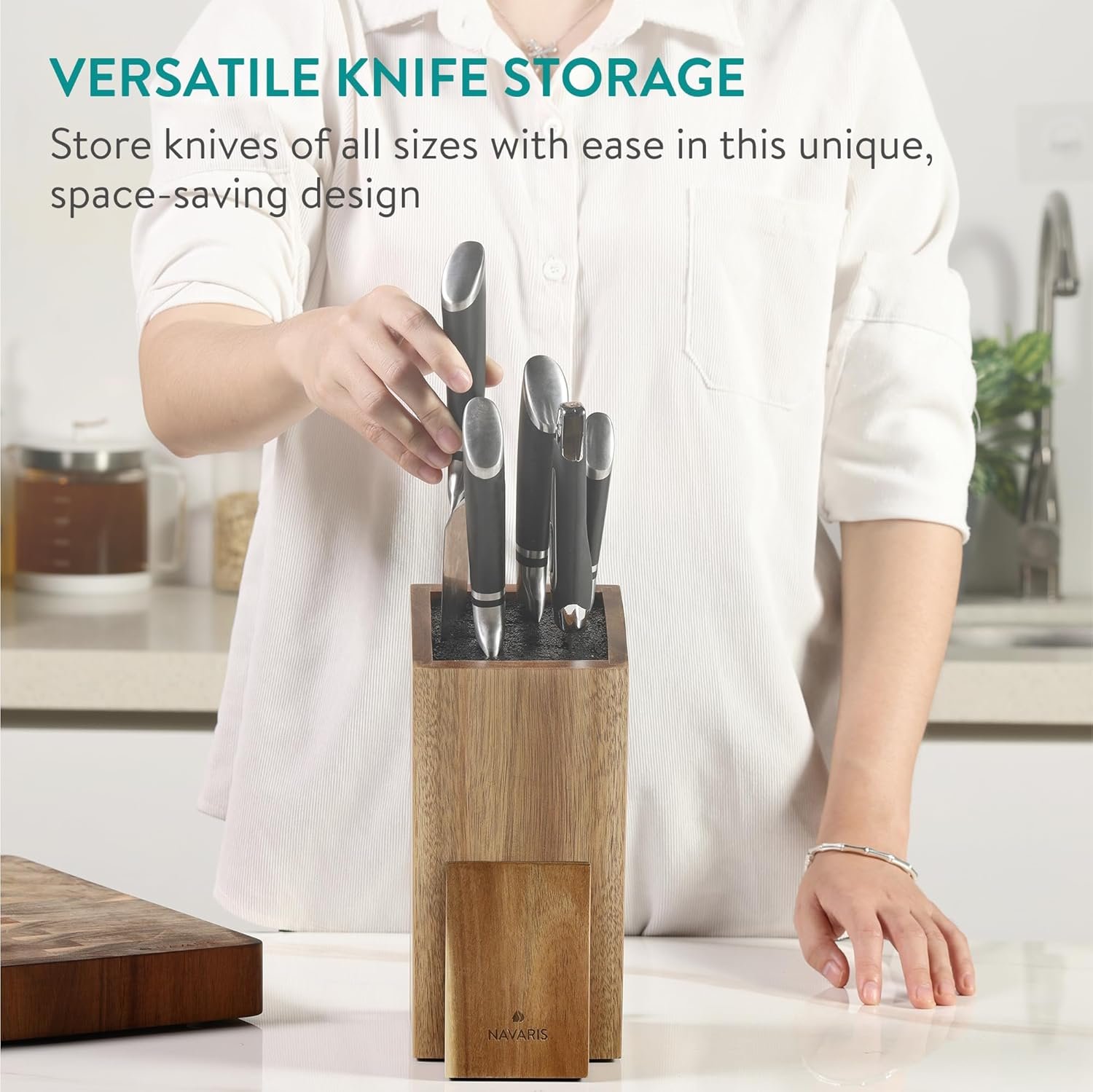 Η βάση μαχαιριών Knife Block της Navaris είναι κατασκευασμένη από υψηλής ποιότητας ξύλο ακακίας και αποτελεί τo ιδανικό gadget κουζίνας για την καθημερινή χρήση των μαχαιριών σας, καθώς σας εξασφαλίζει την τέλεια προσβασιμότητα την ώρα που μαγειρεύετε.