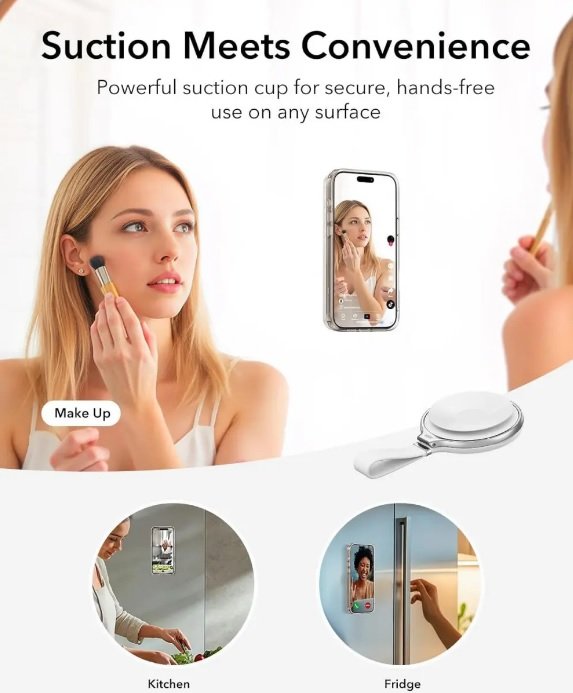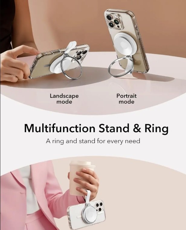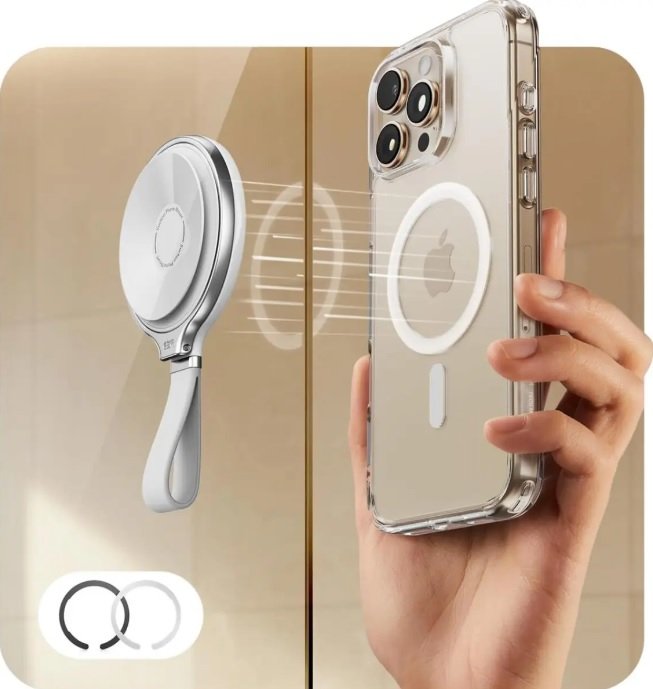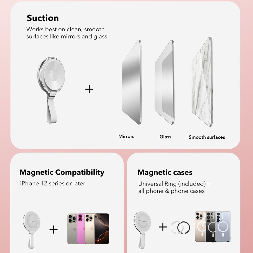 Το ενσωματωμένο δαχτυλίδι μετατρέπεται σε ένα πρακτικό kickstand, ενώ η τοποθέτηση της βεντούζας σε επίπεδες επιφάνειες σας διευκολύνει στο μακιγιάζ, σε διάφορες εργασίες στην κουζίνα και σε πολλά ακόμα! Είναι συμβατή με iPhone που διαθέτουν MagSafe, αλλά και με όλα τα άλλα smartphones χάρη στους μαγνητικούς δακτύλιους που περιλαμβάνονται.