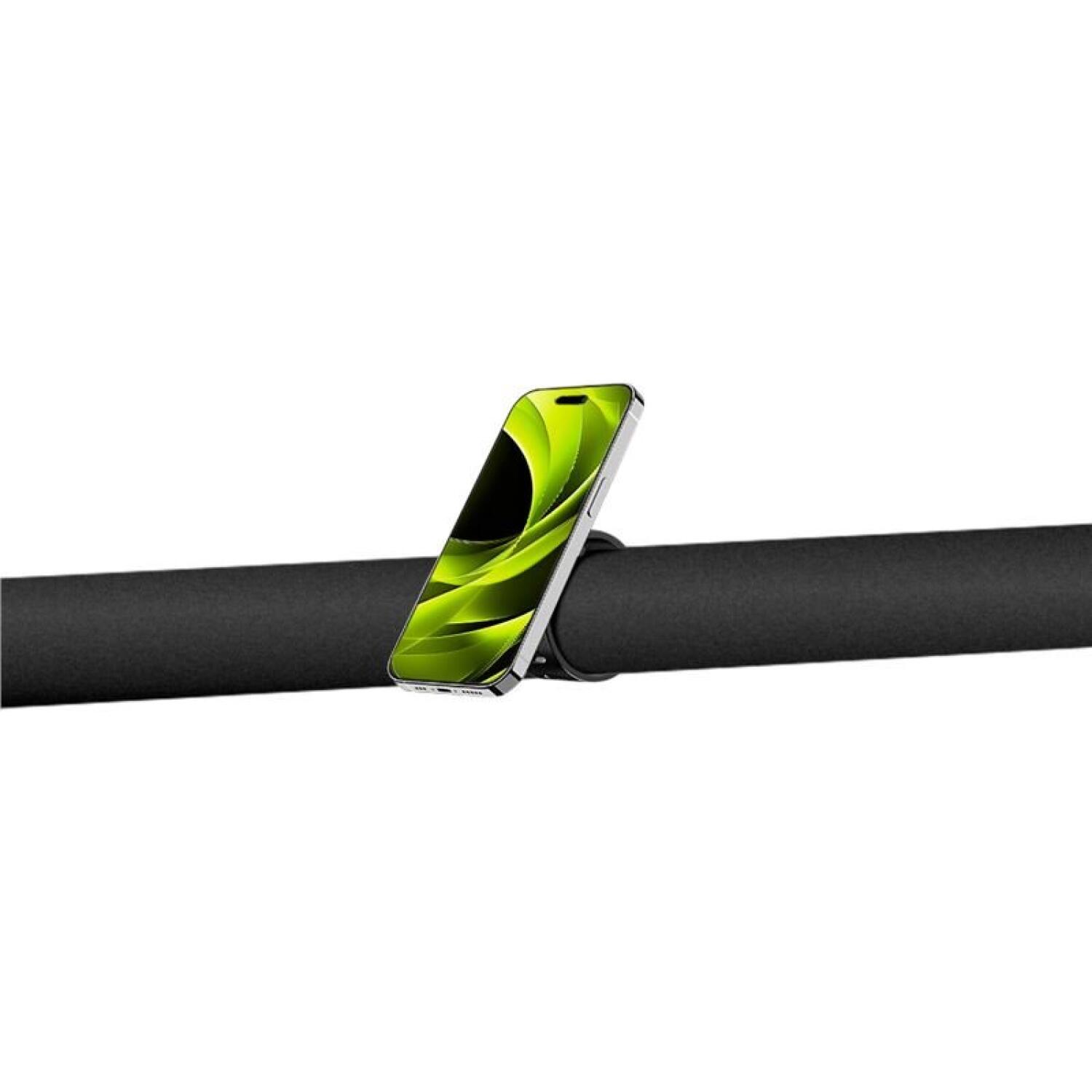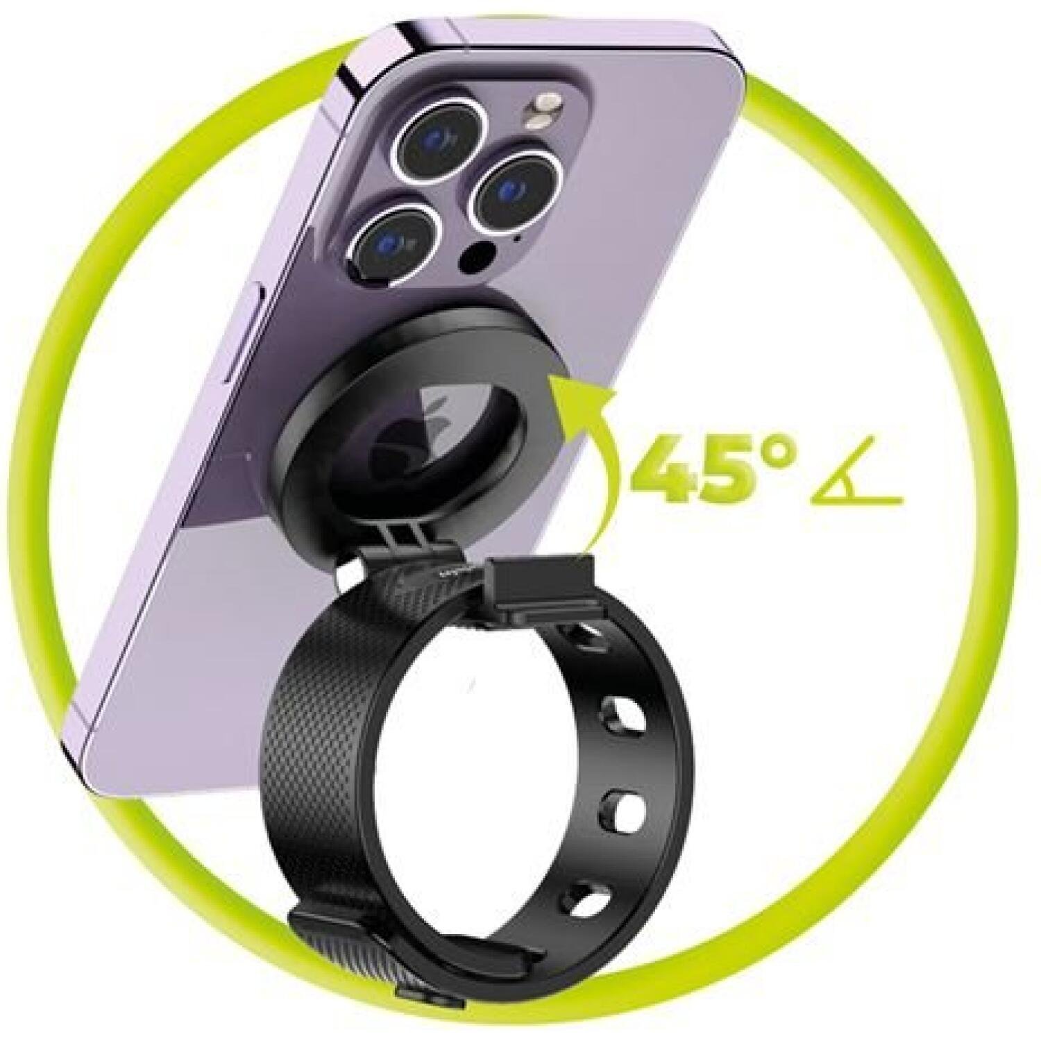 Επίσης, είναι ρυθμιζόμενη, καθώς επιτρέπει την κλίση έως 45°, ώστε να έχετε πάντα την πιο άνετη γωνία θέασης. Το αντιολισθητικό λουράκι σιλικόνης, διαστάσεων 161 x 30 mm, αγκαλιάζει με ασφάλεια σωλήνες και λαβές κάθε τύπου, ενώ η τοποθέτησή του, γίνεται εύκολα και γρήγορα, χωρίς εργαλεία.