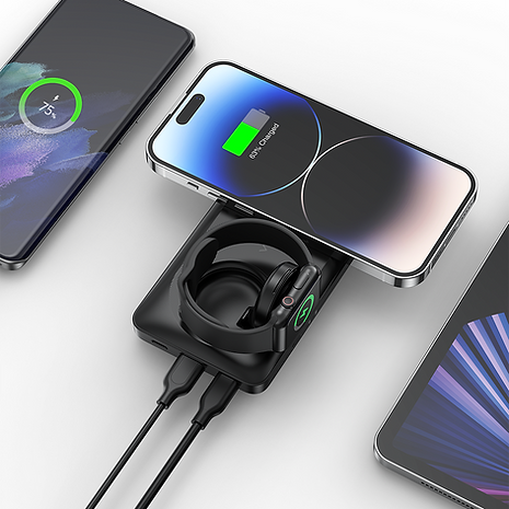 Ασύρματη φόρτιση συμβατή με: Apple Watch Ultra2/Ultra1/SE/9/8/7/6/5/4/3/2, AirPods Pro 2/Pro/3/2, iPhone 15 Pro Max/15 Plus/15 Pro/15/14/14Plus/14Pro/14ProMax/13 Mini/13/13 Pro/13 Pro Max/12 Mini/12/12 Pro/12 Pro Max/iPhone 11/X/8 και άλλες συσκευές με δυνατότητα Qi. Είναι επίσης συμβατό με τις περισσότερες συσκευές της αγοράς, όπως Smartwatch, Smartphone όταν χρησιμοποιείτε τις εξόδους Type-C ή USB-A του PowerBank.
