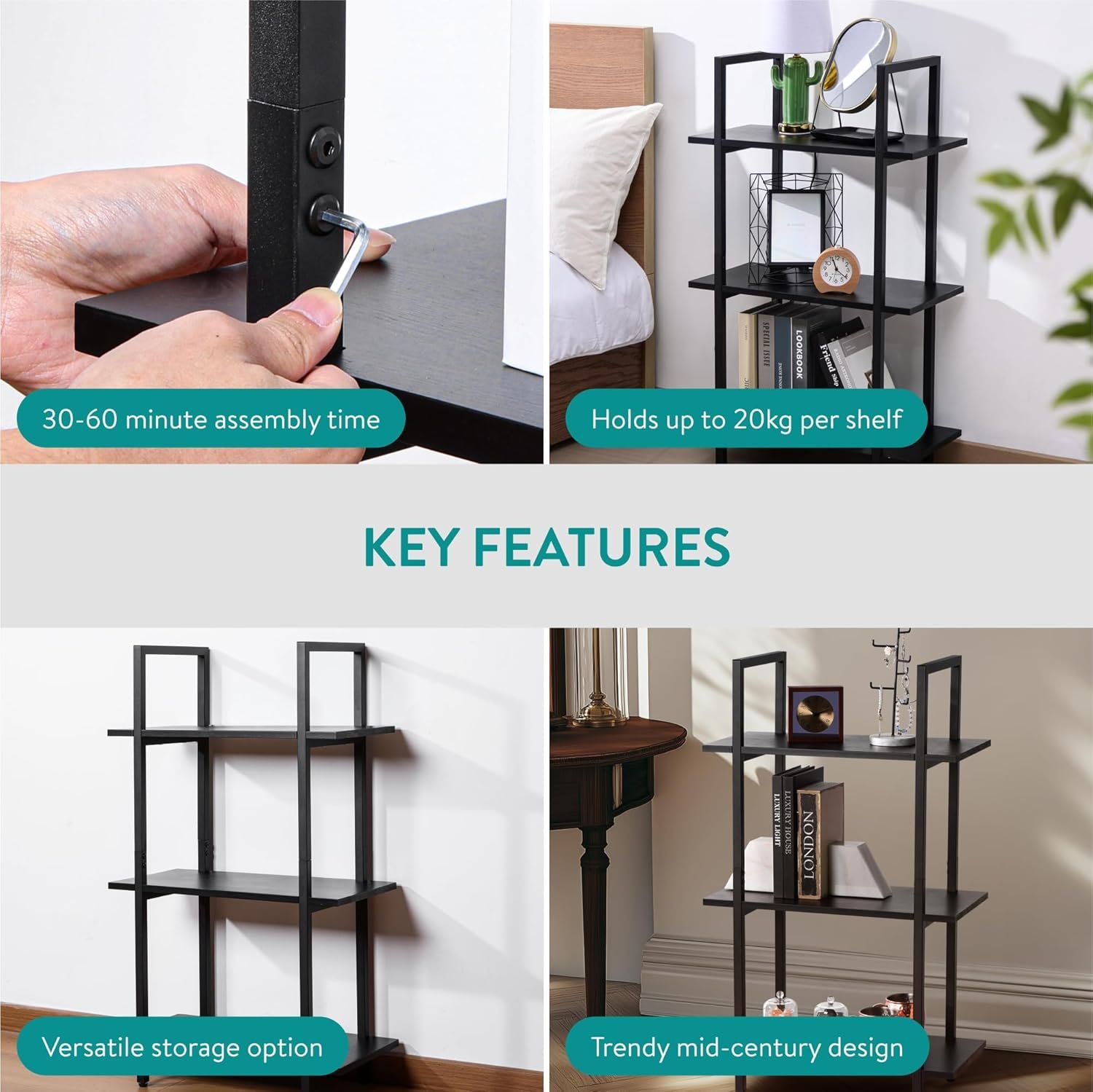 Διαθέτει τρία ευρύχωρα ράφια από μασίφ ξύλο πεύκου και ανθεκτικό μεταλλικό σκελετό, μία στιβαρή κατασκευή για μακροχρόνια χρήση με κομψό design. Οι ρετρό επιρροές και ο συνδυασμός των υλικών με το μαύρο χρώμα, ταιριάζουν υπέροχα αν έχετε μία minimal, industrial και scandinavian διακόσμηση.