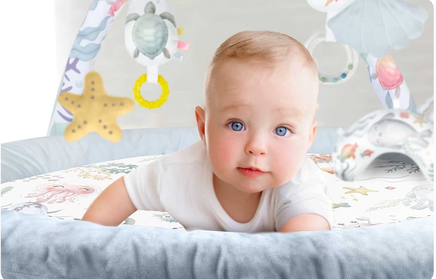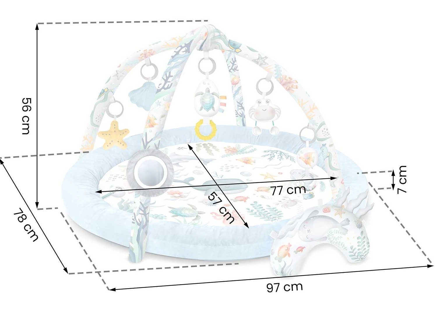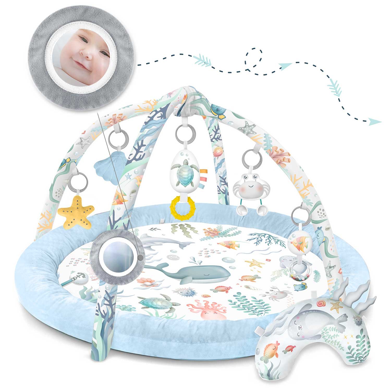 Με 7 πολυλειτουργικά, πρωτότυπα παιχνίδια και ένα μαξιλαράκι από ύφασμα minky, το μωρό σας έχει πολλές δυνατότητες για παιχνίδι και εκμάθηση. Κάθε παιχνίδι έχει σχεδιαστεί με βάση τις ανάγκες του παιδιού και τις τελευταίες επιστημονικές έρευνες για την ανάπτυξή του.