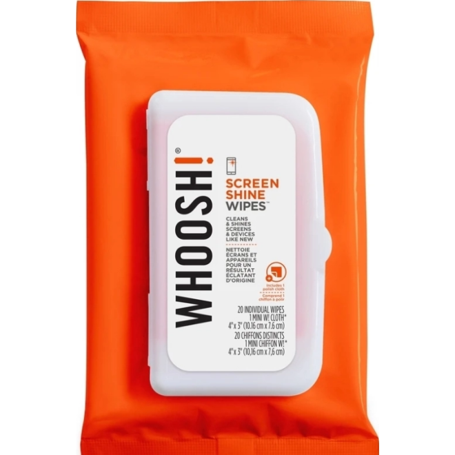 Τα Screen Shine Wipes της Whoosh! είναι ειδικά σχεδιασμένο για να καθαρίζει, να γυαλίζει και να προστατεύει οποιαδήποτε οθόνη smartphone και ηλεκτρονική συσκευή και δεν περιλαμβάνει τίποτα που θα καταστρέψει, θα χαράξει ή θα βλάψει οποιαδήποτε από τις οθόνες ή τις συσκευές σας.